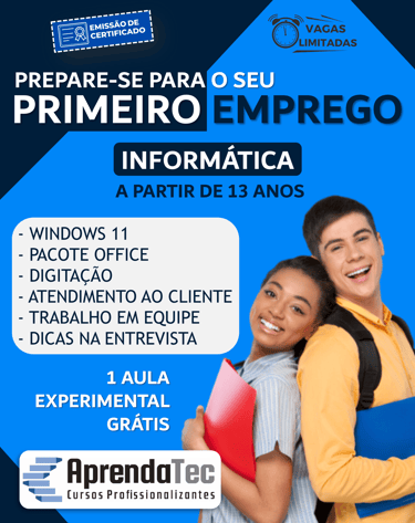 O curso Informática Essencial oferece uma introdução completa à informática, contemplando conceitos fundamentais, aplicativos úteis, navegação no Windows 11, habilidades com Internet e segurança, redes sociais e os recursos essenciais do Microsoft Office, como Word, Excel, PowerPoint e Outlook. Uma formação prática para quem quer utilizar o computador com mais autonomia no ambiente profissional e pessoal.